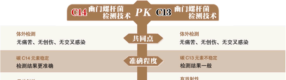 “C14幽门螺杆菌检测技术”是世界卫生组织极力倡导,受到国际医学界权威人士充分肯定的先进技术,是目前 检查幽门螺杆菌最为方便、快捷的一种技术,被称为“胃病检验史上的里程碑”。该技术不仅具有现代医学创新特征 ,而且临床检查无辐射、无创伤、方便、卫生、无副作用,不会造成基因突变。C14幽门螺杆菌检测技术不仅令许 多高血压、心脏病、对传统胃镜恐惧的患者避免了做胃镜的不适,而且适用于孕妇、乳母和婴幼儿,是最安全最环 保的一种幽门螺杆菌检测方式。